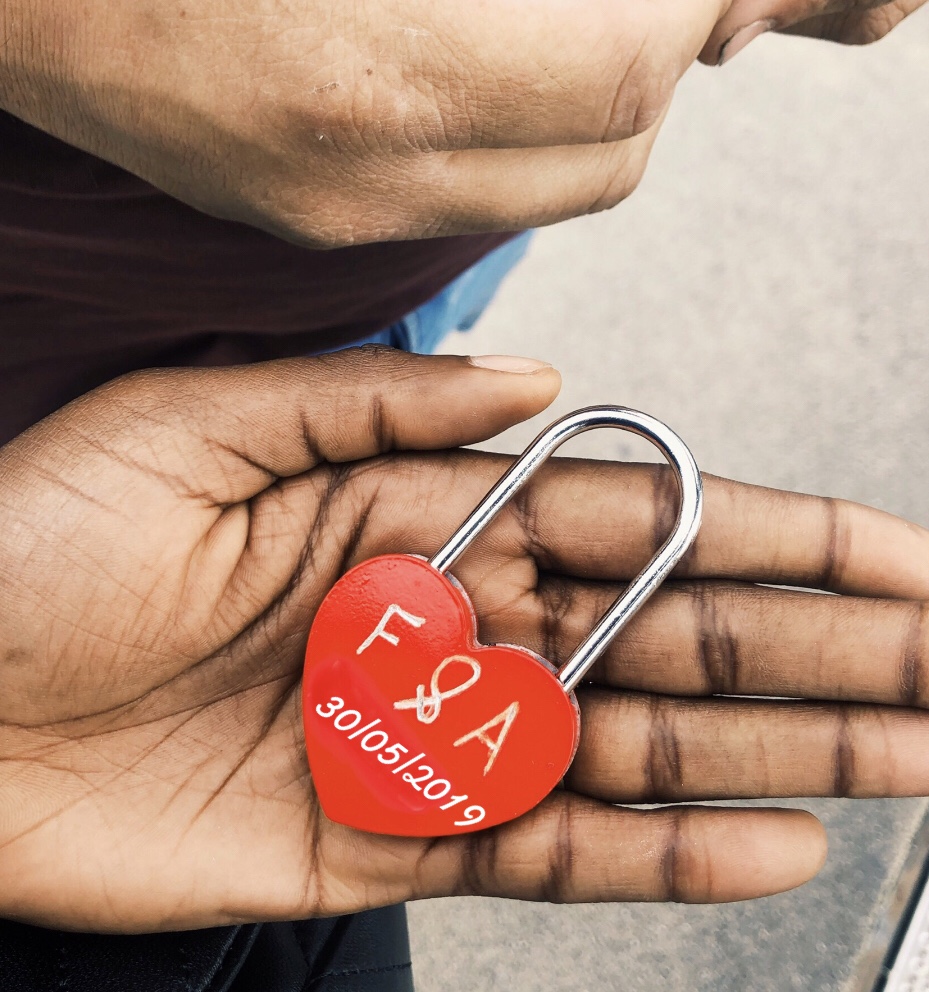 Très cliché pour nos 5 ans nous avons fait graver un cadenas en cœur pour l’occasion de nos initiales et notre nom (mon futur nom). 5€ le cadenas + 1 € la gravure.