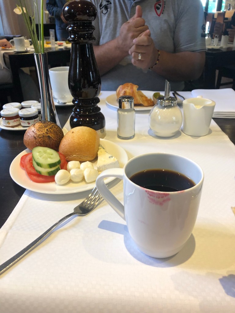 Pendant nos périples, on mange uniquement matin et soir, si vraiment on a faim à midi, on ne se privera pas non plus. Tous les matins: Brunch dans notre hôtel: Le Fleming’s hotel frankfurt-messe un hotel de ville très bien situé, proposant pas mal de services en plus.