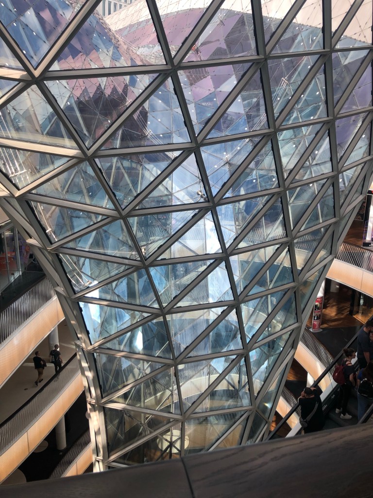 Nous n’avons pas fait beaucoup de shopping car nous étions à pied et voulions éviter les allés retours à l’hôtel. Cependant 2 principaux centres/espaces commerciaux qui nous on plus: La Skyline Plaza et My Zeil qui est immense mais encore plus intéressant à cause son architecture en verre avec un espèce de tourbillon en verre qui commence du dernier étage et se termine sur la façade avant du centre.